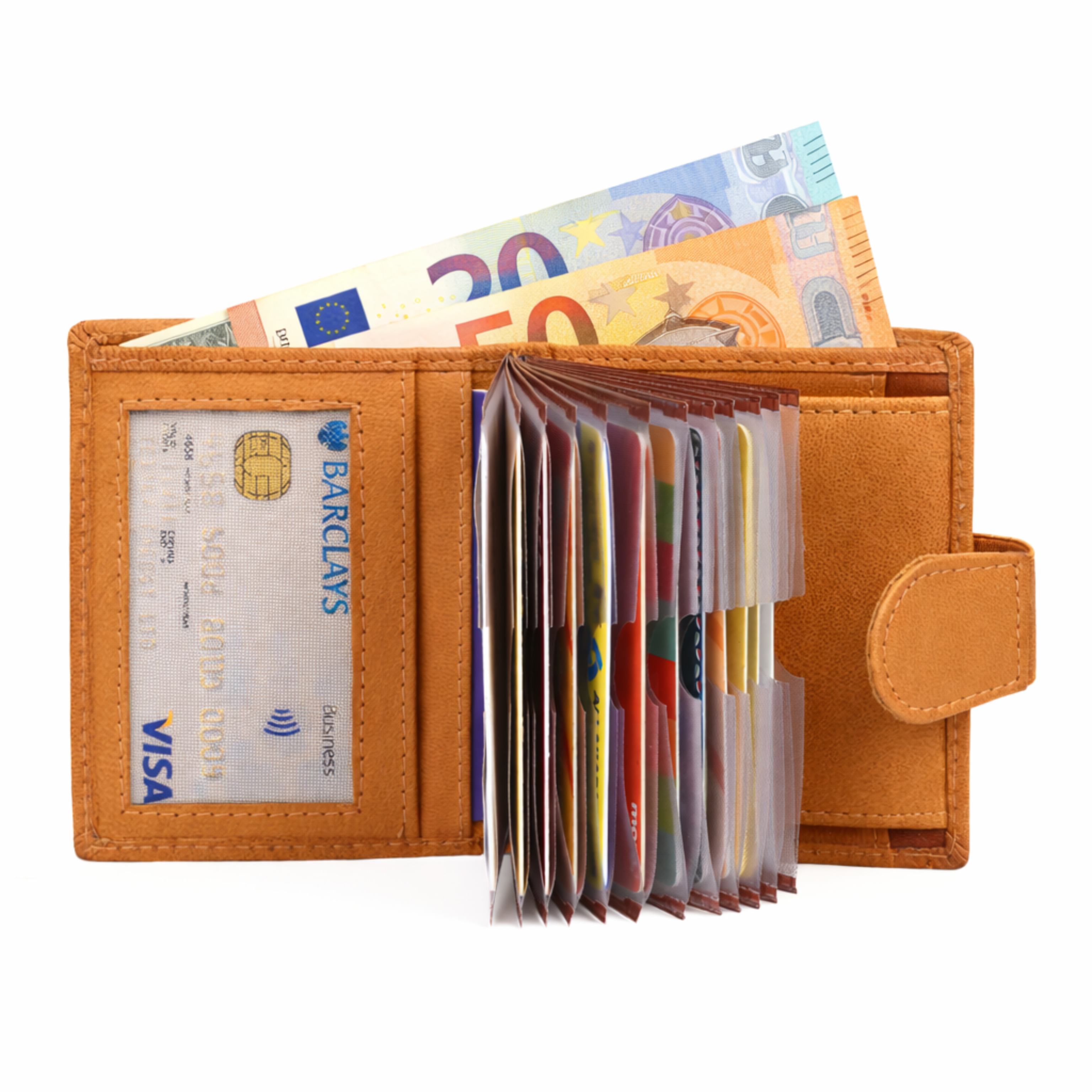 15 Fächer für Kreditkarten, Ausweise, Papiere, Kundenkarten mit Sichtfenster bzw. mit Sichtgitter / 3 Fächer davon an den Seiten.